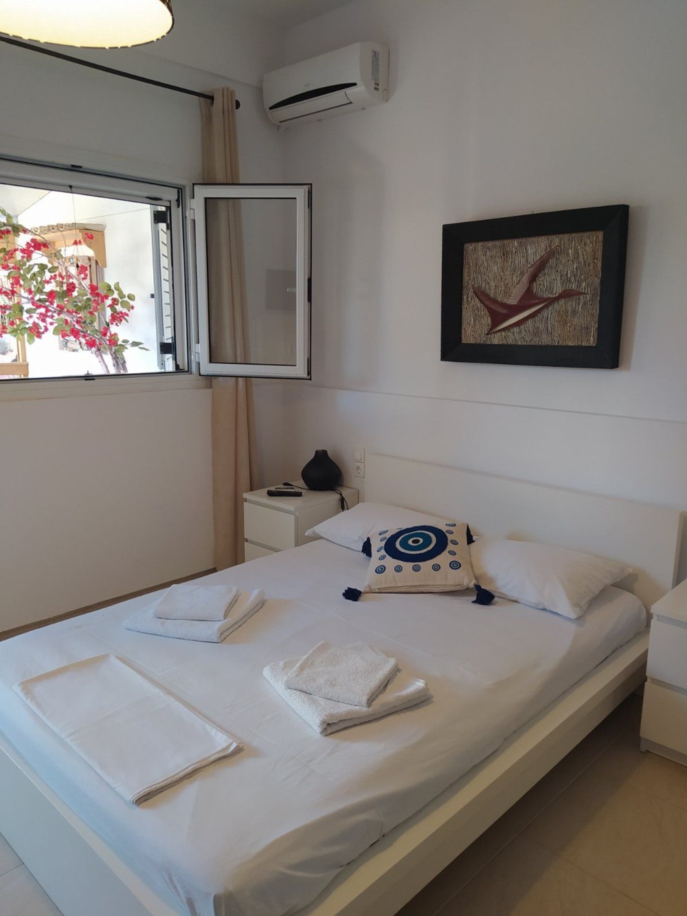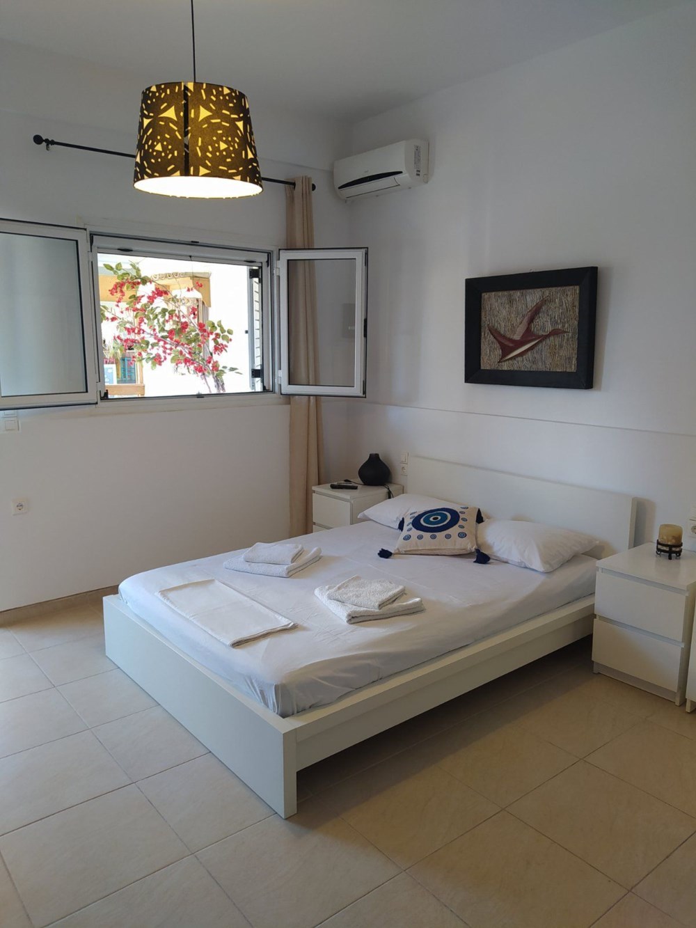 The first-floor apartment has a bedroom with a queen bed, as well as two additional single beds in the open-plan area of the kitchen. The kitchen itself is fully equipped, and there is also a bathroom with a shower. The apartment features TV and air-conditioning as well.